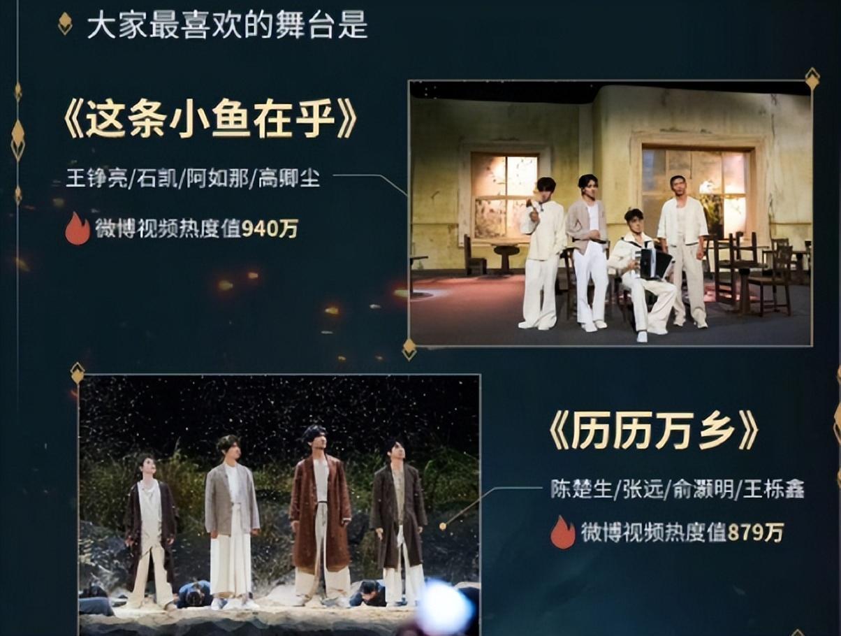 从官方发出的战报上看,我们可以发现本季节目最受喜爱的舞台是《这条小鱼在乎》,这首歌曲是第三轮舞台公演,王铮亮、石凯、阿如那、高卿尘演唱的,这首歌曲确实让很多人“惊艳”,因为在节目组的镜头下,王铮亮、石凯、阿如那、高卿尘显得都非常温柔,观众们瞬间发现,他们四人的颜值。